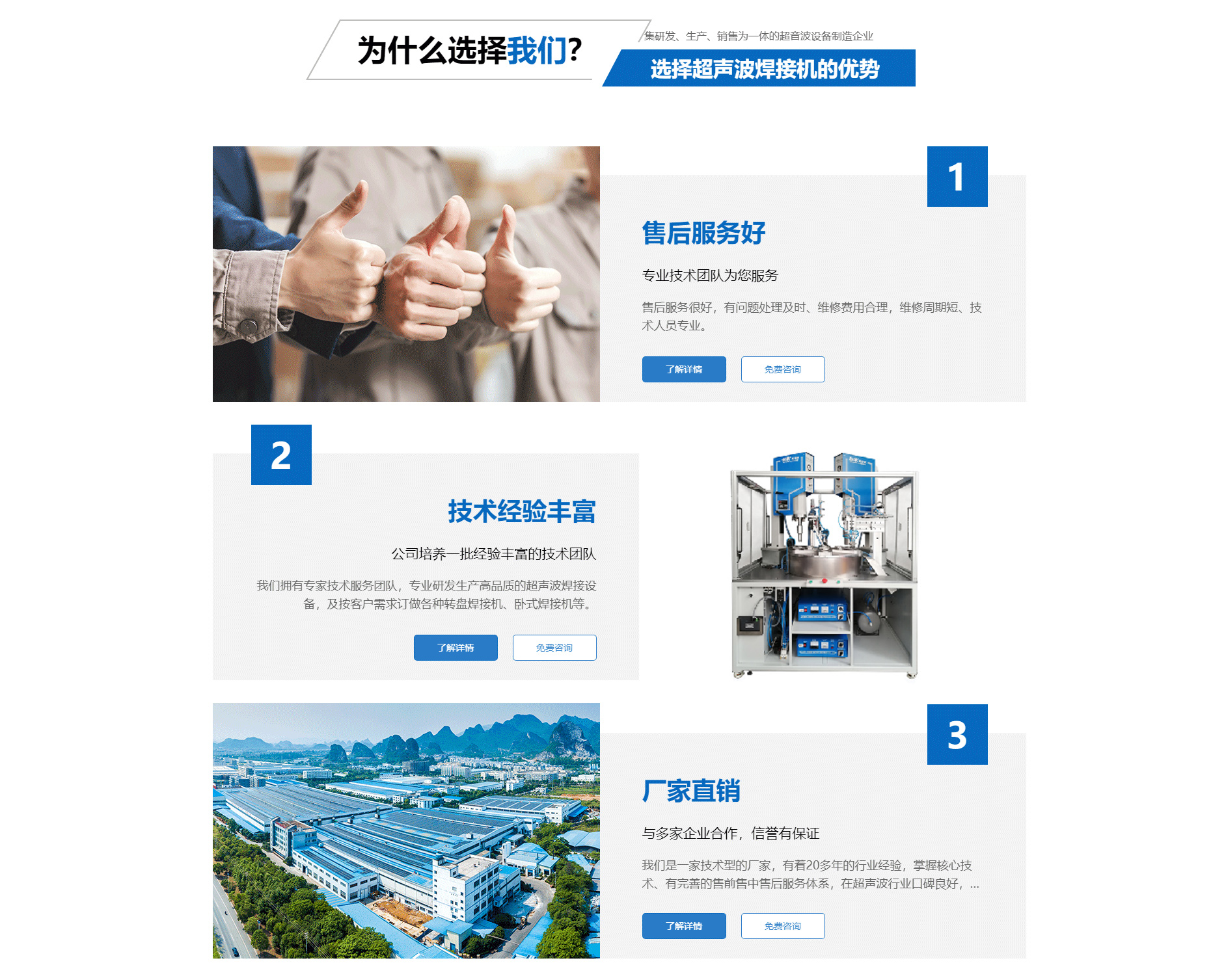 關(guān)于我們廈門勁榮機(jī)械設(shè)備有限公司是一家集研發(fā)、生產(chǎn)、銷售為一體的超音波設(shè)備制造企業(yè),主要產(chǎn)品包括多規(guī)格型號(hào)的超音波塑膠熔接機(jī)、熱板式塑料焊接機(jī)、多工位轉(zhuǎn)盤焊接機(jī)、振動(dòng)摩擦焊接機(jī)、旋轉(zhuǎn)式塑膠熔接機(jī)及配套的工裝夾具等。公司自2003年成立以來,一直致力于產(chǎn)品不斷完善中,并追求產(chǎn)品的精益求精,于2004年向國家商標(biāo)局注冊(cè)了“勁榮”牌商標(biāo),2009年榮獲廈門市商標(biāo)。 經(jīng)過多年的努力,公司已經(jīng)發(fā)展成為占地面積2000余平方米、擁有員工50余人的企業(yè)。公司一直將“品質(zhì)是企業(yè)發(fā)展的原動(dòng)力”作為經(jīng)營理念,嚴(yán)把質(zhì)量關(guān),建立了一整套有效的安全生產(chǎn)及管理模式,不僅贏得了同行的認(rèn)可,更取得了客戶的信賴,先后與九牧集團(tuán)、路達(dá)工業(yè)、建霖集團(tuán)、西伯電子、蒙發(fā)利實(shí)業(yè)、松霖科技、銥科集團(tuán)、科司特電子等公司建立了長期的合作關(guān)系。 面對(duì)已經(jīng)取得的成績,我們不驕不滿,因?yàn)樯钪獦I(yè)績只能代表過去,只有靠良好的產(chǎn)品質(zhì)量和完善的售后服務(wù)才能在客戶中口碑相傳,在...